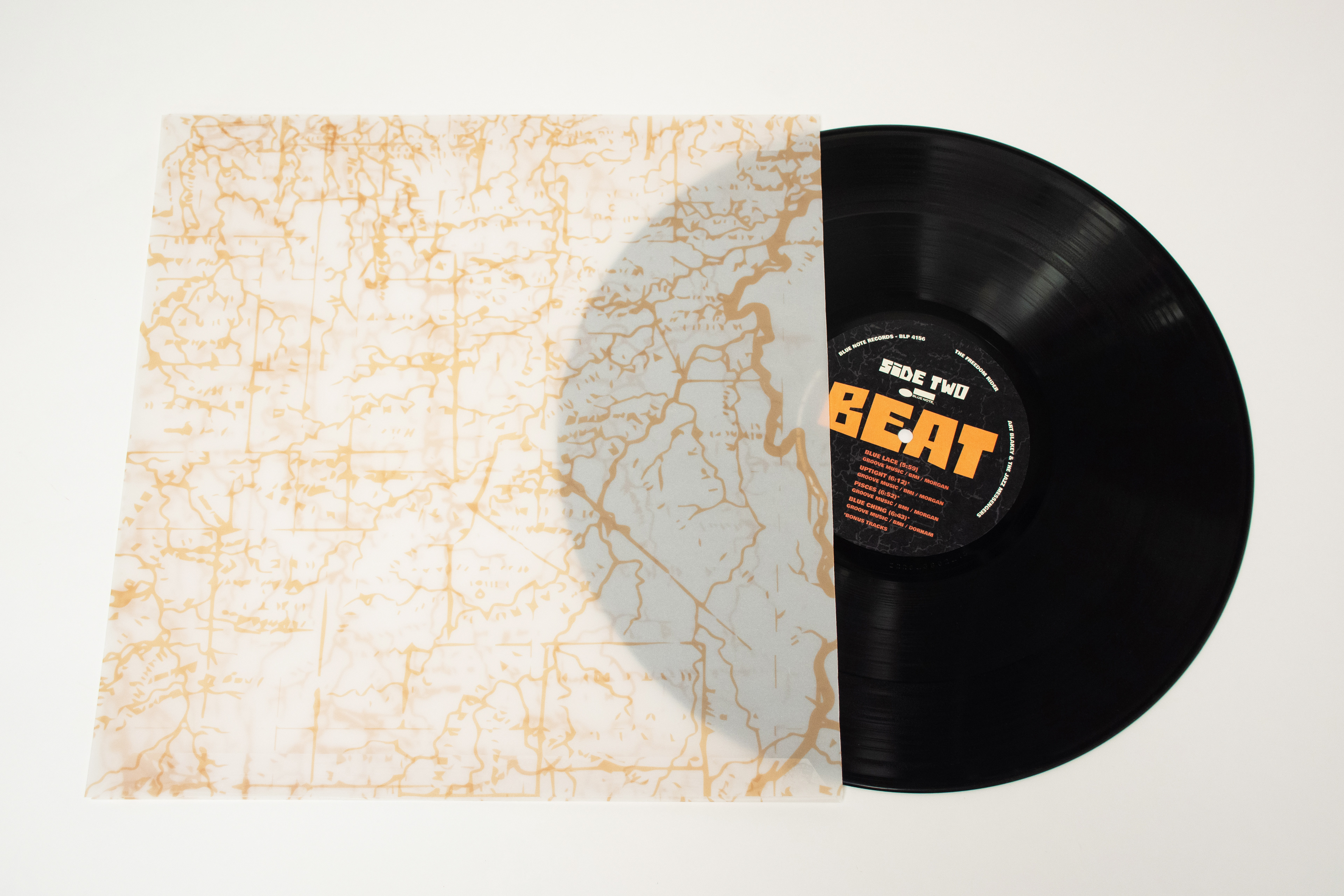 Record redesign for Art Blakey's The Freedom Rider. Record redesign includes jacket with vellum sleeve.